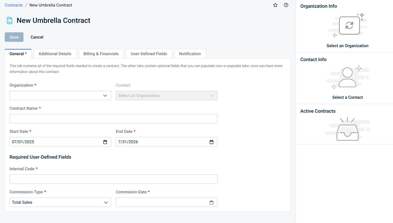 This tab lets you name the contract, link it to an organization and contact, set its start and end dates, and fill in any required custom fields. This tab must be complete before the contract can be saved.