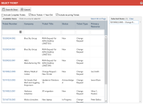 All tickets associated with the organization that you have access to, and that are not yet associated with the ticket or opportunity, will be displayed. - To show complete tickets in the data selector, select Include Complete Tickets.