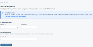 • Administrators can connect and disconnect their organization's Autotask instance from their instance of IT Glue. Refer to Integration setup.