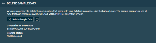 IMPORTANT This action cannot be undone. Deleting the sample data will also cause the Show Me How... guide with the Tasks for Autotask Onboarding to be removed! Please wait with the deletion of sample data until your onboarding process is complete.