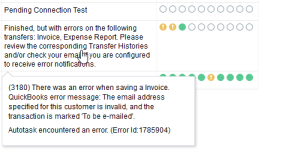 • Finished, but with errors on the following transfers: Invoice, Timesheet, Expense Report, Purchase Order, Inventory Sync. Please review the corresponding Transfer History/Histories and/or check your email if you are configured to receive error notifications.