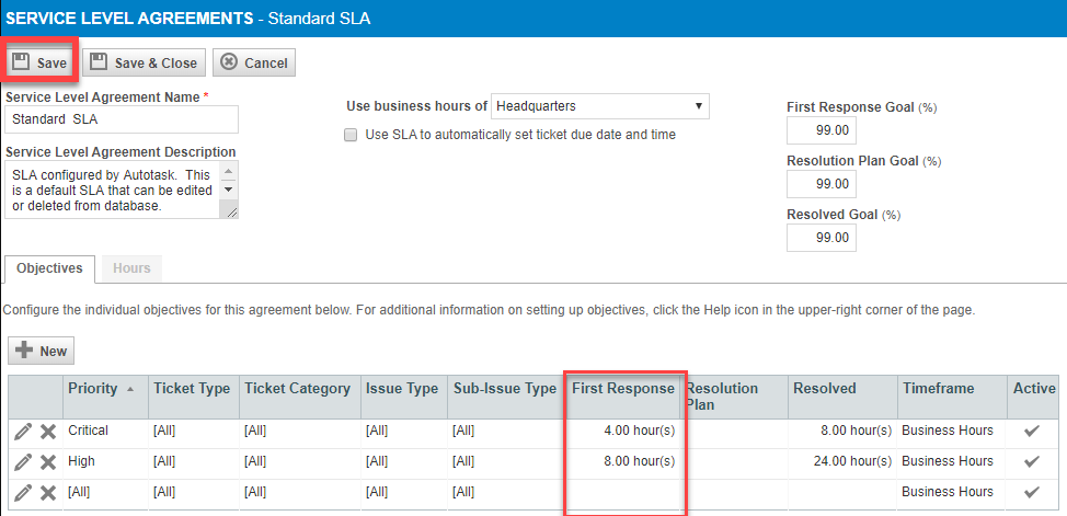 Enter the correct target First Response hours and click Save.