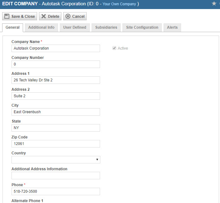 If your local organization details change, you need to ensure that all changes are reflected in your Autotask instance. To update your Autotask instance, you need to edit the details of your zero account.