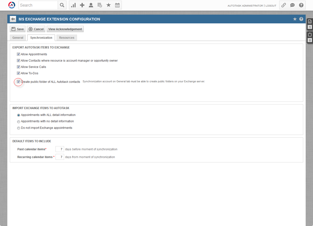 In Autotask, navigate to Autotask Menu > Admin > Extensions & Integrations > MS Exchange. In the Synchronization tab, check Create public folder of ALL Autotask contacts and click Save.