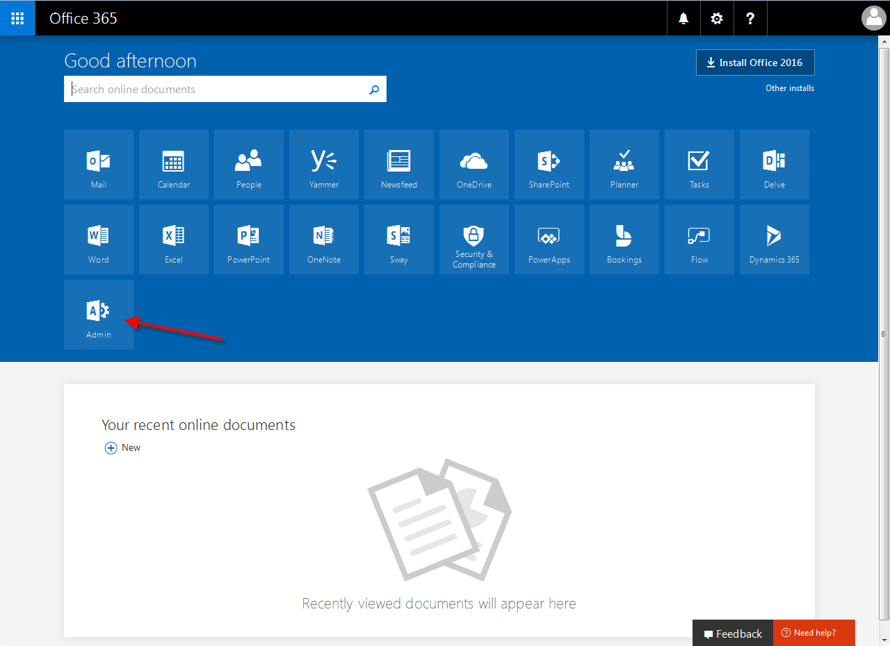 Log in to Office 365 as administrator user via the Microsoft Office 365 portal (external link). Then, click Admin.