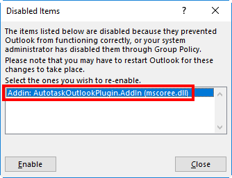 - If the add-in is listed in the Disabled section, go to enable disabled add-in.