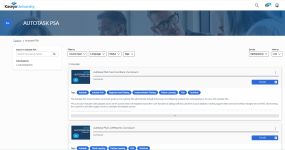 Recorded webinars and certification courses containing videos are available for all users in Kaseya University. Kaseya University is accessed through KaseyaOne. Click Kaseya University on the KaseyaOne left navigation menu to open Kaseya University. Once you are in Kaseya University, click Catalog > Autotask to view and enroll in available courses and recordings: