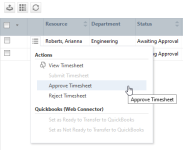- To approve the selected timesheets, hover over the context menu and select Approve Selected Timesheets.