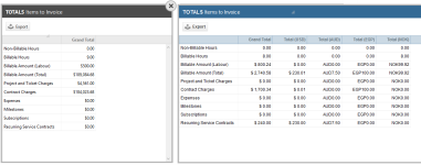 ![]() The Totals dialog box displays the Grand Total for all columns you have selected on the table column chooser. If you use a single currency, it simply lists the grand totals for all columns you have selected on the table column chooser. This list can be exported to .CSV. If Multi-currency is enabled, additional columns appear on the table (one for each additional currency). Each will represent a per-currency total of all returned billing items for the organizations that have each currency. Currency values in the Grand Total column are calculated from the billing items' internal currency values and are displayed in the internal currency. |