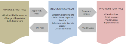 - When they are approved and posted, they move to the Items to Invoice page. Here, the invoice is put together. You decide which items will appear on the invoice, what template to use, etc.