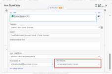 When you add an attachment to a ticket note, task note, or project note, you can choose to include the attachment on the notification tab. The setting will be respected for internal and external users.