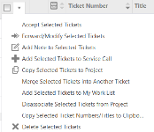 : provides access to multiple actions that you can complete for each item in the list; for example, available actions for tickets can include open the ticket detail view or edit page, forward/modify or copy the ticket, or add a time entry.