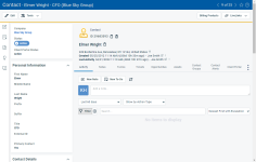 In all tab views, a summary of the contact's details, including their unique ID, name, photo, and contact information appears above the tab bar at the top of the Contact page. Extended contact information appears in the panel on the left side of the page.