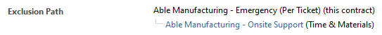The exclusion path shows a tiered hierarchy of contract exclusions applied to the contract you are viewing and any contracts downstream. First, the exclusion contract is applied, and if the role or work type is disallowed under the exclusion contract, as well, the exclusion contract of the exclusion contract is applied. This is also called an exclusion tree. Refer to Contract Exclusions.