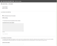These generic descriptions can be edited at the contract level. Editing the invoice description allows you to customize what is shown on the invoice for a specific customer. The internal description will display in service and service bundle selectors where the contract has been selected. This can be used to identify and distinguish services/bundles from one another, especially if the same service/bundle is on the contract more than once.