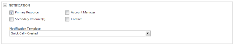 Primary Resource, Secondary Resource(s), Account Manager, Contact | Select a check box to send an email notification to the primary resource, the secondary resources, and/or the account manager. |