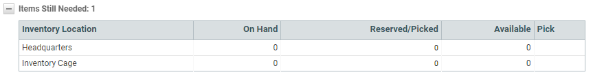The table lists each inventory location from which the items were picked or ordered. In addition, if any items were transferred to a resource, the table lists the resource name, preceded by RESOURCE:.