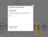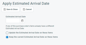 You can specify an estimated arrival date on purchase order items. The Estimated Arrival Date field appears on the Purchase Order Item page Memo form. There is also an Estimated Arrival Date window that will open when you submit a purchase order. From this window you can specify an estimated arrival date for any items on the purchase order that do not have a date specified.