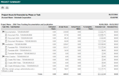 Estimated hours, actual hours, actual hours billed, % complete hours, extended cost, extended price and summary notes for the selected project at the task or phase level. |