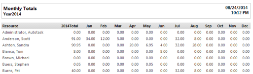 Hours worked by all resources for a specified calendar year, broken down by month. The internal cost of the labor is displayed when the "Amount" radio button is selected. |