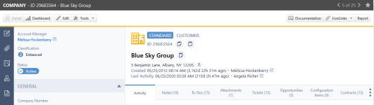 Any messages or banners associated with the entity appear above the panels. Tickets, organizations, contacts, opportunities, and devices can have banners.