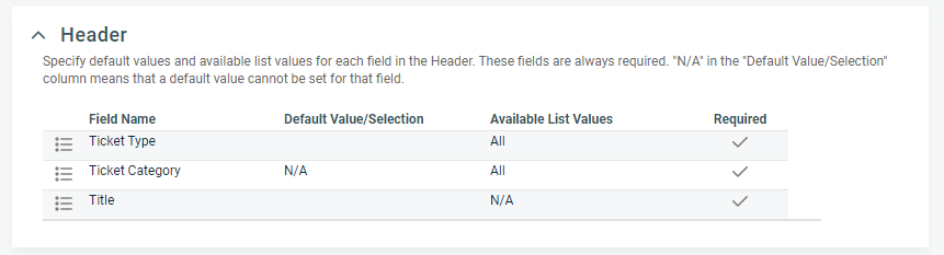 The Header section contains the list of fields that are displayed for every category for that entity. They appear at the top of the main panel when the category is applied. For some fields, you can configure a Default Value/Selection and limit any Available List Values.