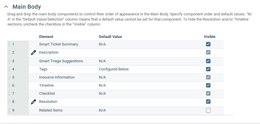 | (tickets) | You can set a default value to populate the Resolution field on all new tickets associated with this ticket category.  For details on the dialog box, refer to Description. | You can hide the resolution component. The Visible check box is editable. You do not need to click the pencil icon. When the check box is selected, the Resolution field appears on the ticket. Click the check box to clear or select it. |
