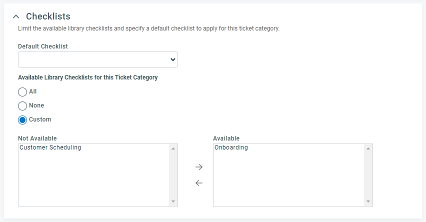 | Ticket Type (tickets only) | If  you want to specify a default ticket type to populate the Ticket Type field on all tickets associated with this category, select it from the menu. Users will be able to change the Ticket Type when adding or editing the ticket. TIP If you want to set one ticket type as the only ticket type for tickets associated with this category, edit the available list values and set the default value as the only item in the menu. | You can limit the items available for selection from the Ticket Type field menu when users add or edit a ticket associated with this category. Click the pencil icon to open the list item selector. Move the items that you want to appear in the menu to the right side panel. Move any items you do not want in the menu to the left. |