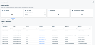 On the Cooper Copilot History page, you can view a history of calls to Cooper Copilot. This page shows the last 6 months of Cooper Copilot requests as well as a general summary of the last 30 days.
