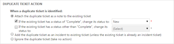 To specify how Autotask should handle an incoming ticket that meets the duplicate ticket definition, check one of the radio buttons under Duplicate Ticket Actions. Depending on the radio button you select in this section, your check box options will change: