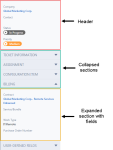 The Details panel is always located to the left of the Main panel. It includes a fixed header that is always shown and a variable number of additional sections that can be expanded and collapsed. They contain the entity fields that are exposed by the category, including User-Defined Fields.