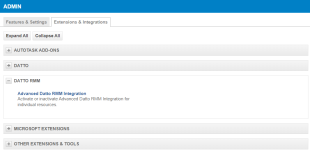 Navigate to Left Navigation Menu > Admin > Admin Categories > Extensions & Integrations > Datto RMM and click Advanced Datto RMM Integration.